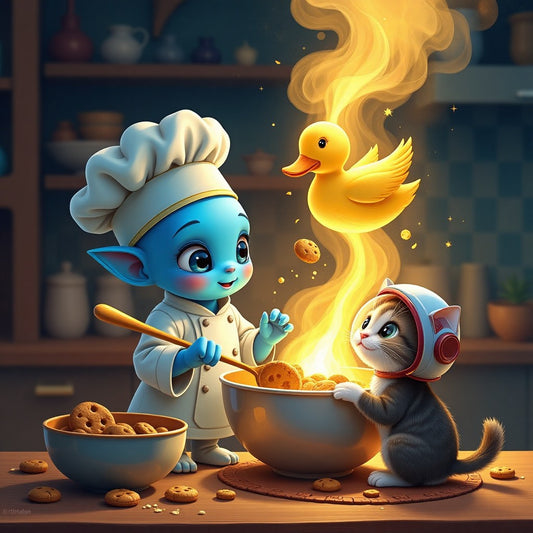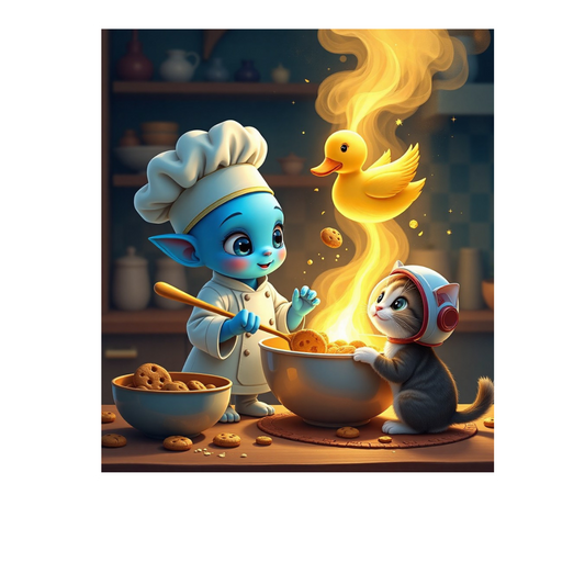 A mysterious treasure chest, a magic spoon, an ancient box of cookie mix and an outer space duck come together to help the little chef and his cute little cat find a happy new home here on planet Earth!